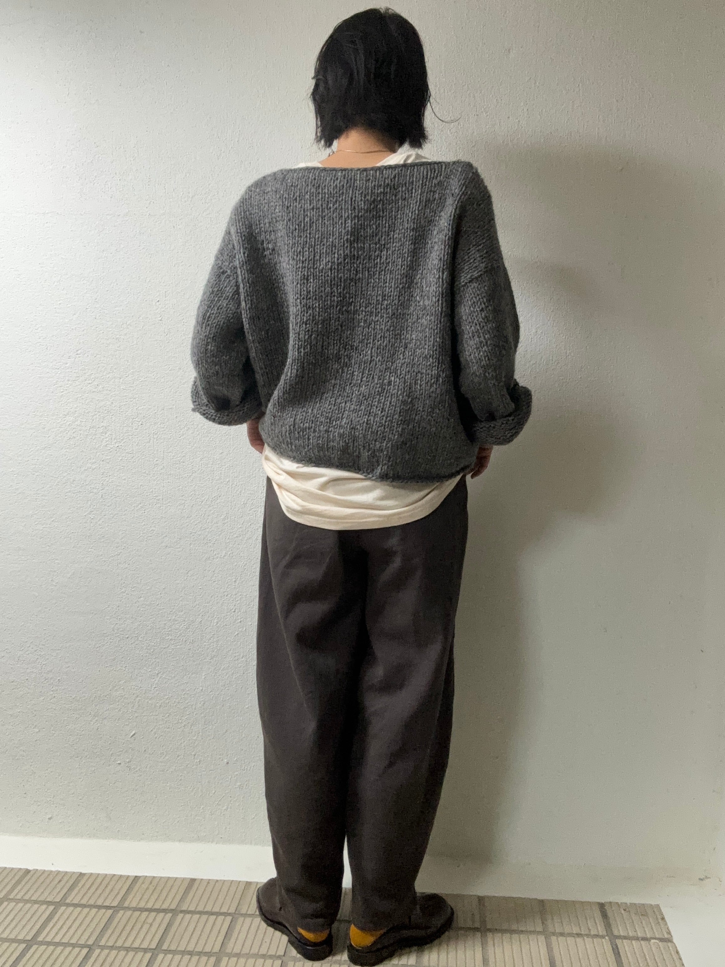 オーバーサイズに着ていただくようデザインしております。5サイズ展開しておりますのでお好きなサイズで編んでくださいね、